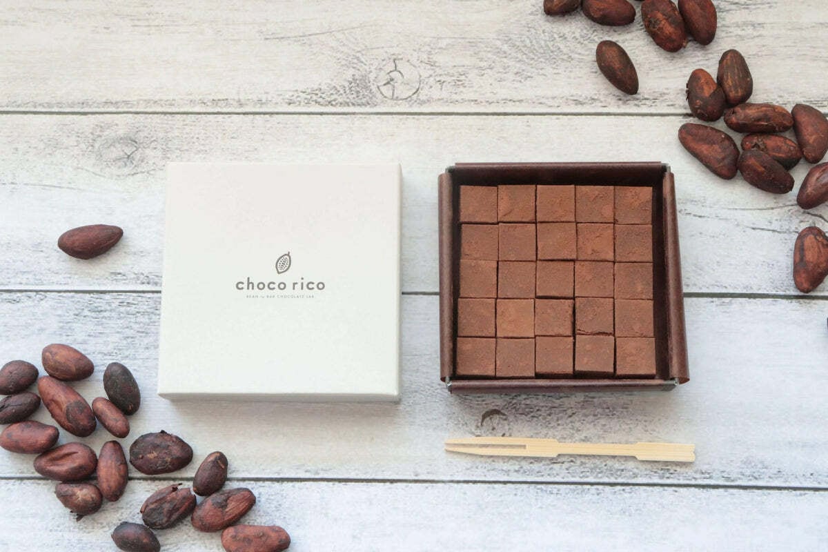 カカオ61%のBean to Barビターミルクチョコレートをベースに、生クリームと無塩バター、香りづけのブランデー(レミーマルタン)を加え、チョコリコの自社工房で丁寧に手作りした至極の生チョコ(プレーン)です。