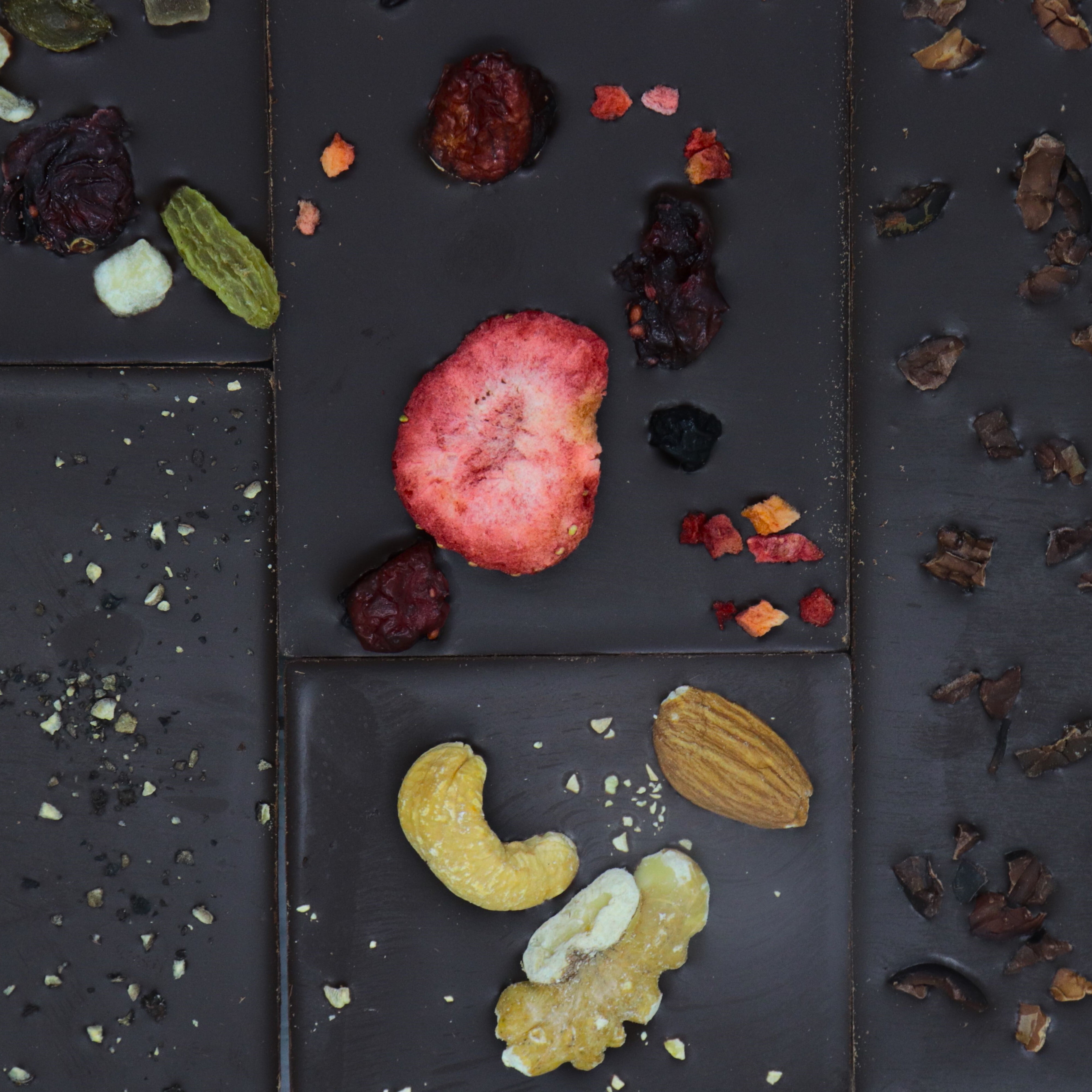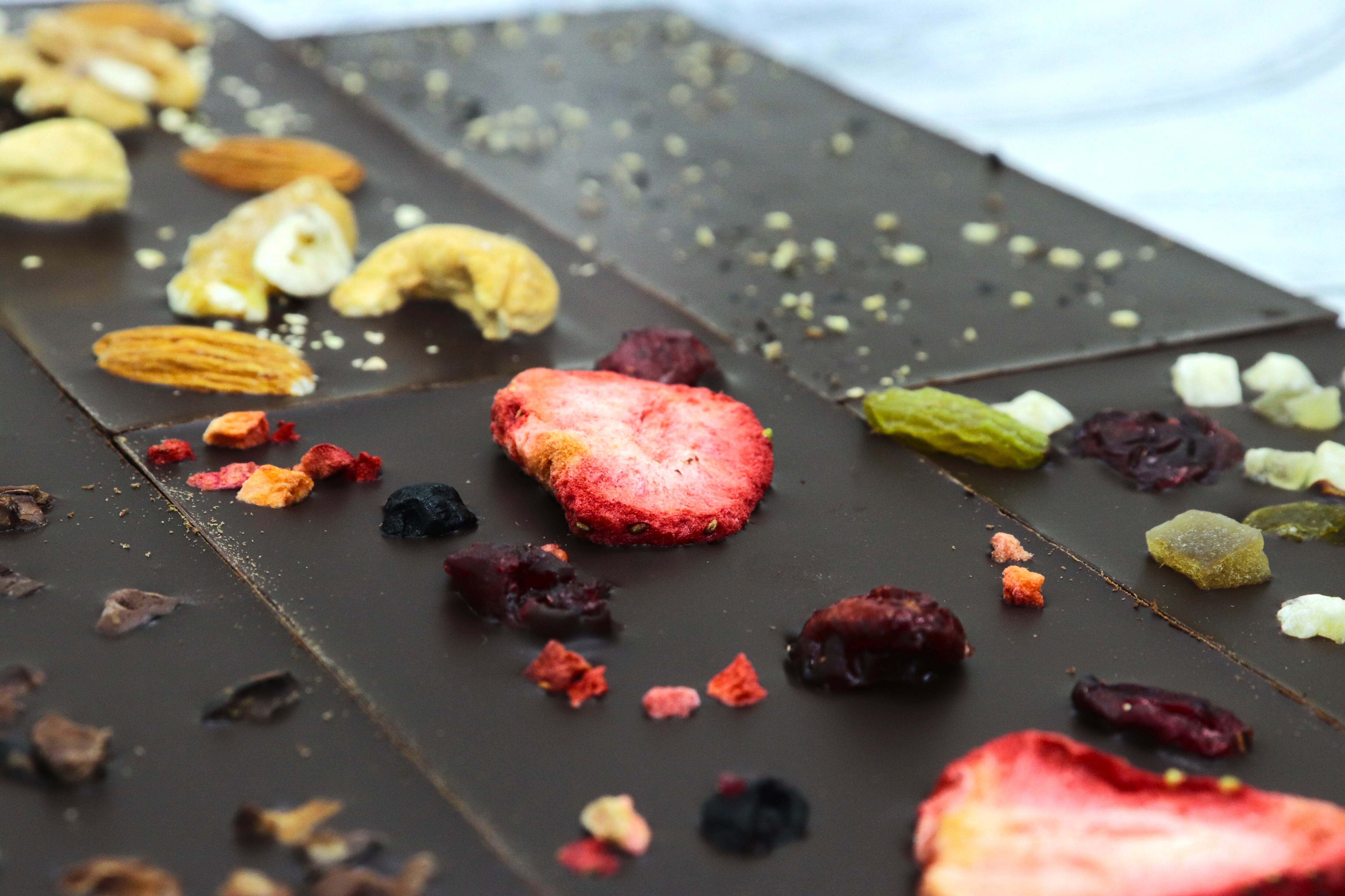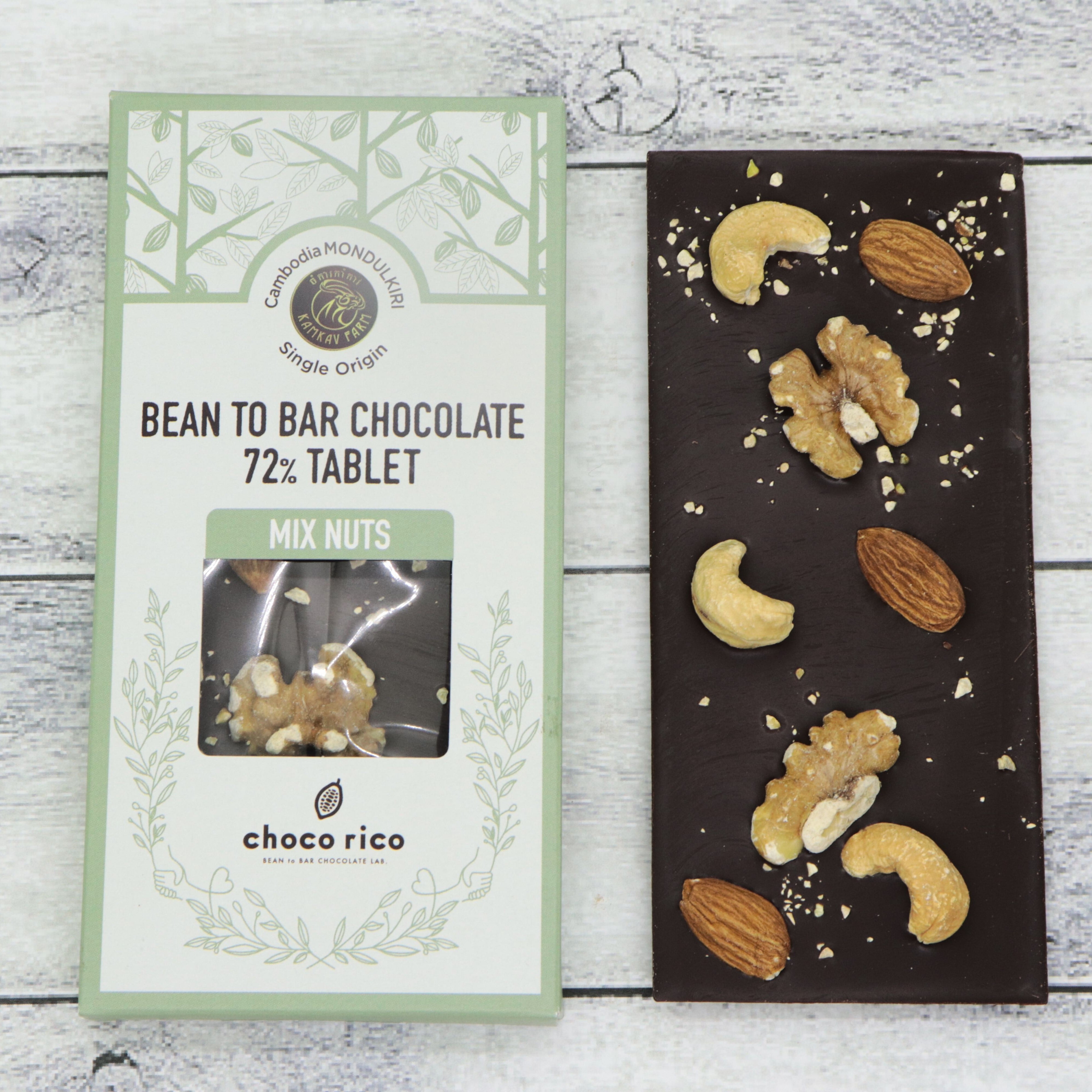 カンボジア産のオーガニックカカオ豆と天然パームシュガーだけを使用し、チョコリコの自社工房で丁寧に手作りしたカカオ72%のBean to Barチョコレートタブレット(板チョコ)に、ミックスナッツをトッピングしました。