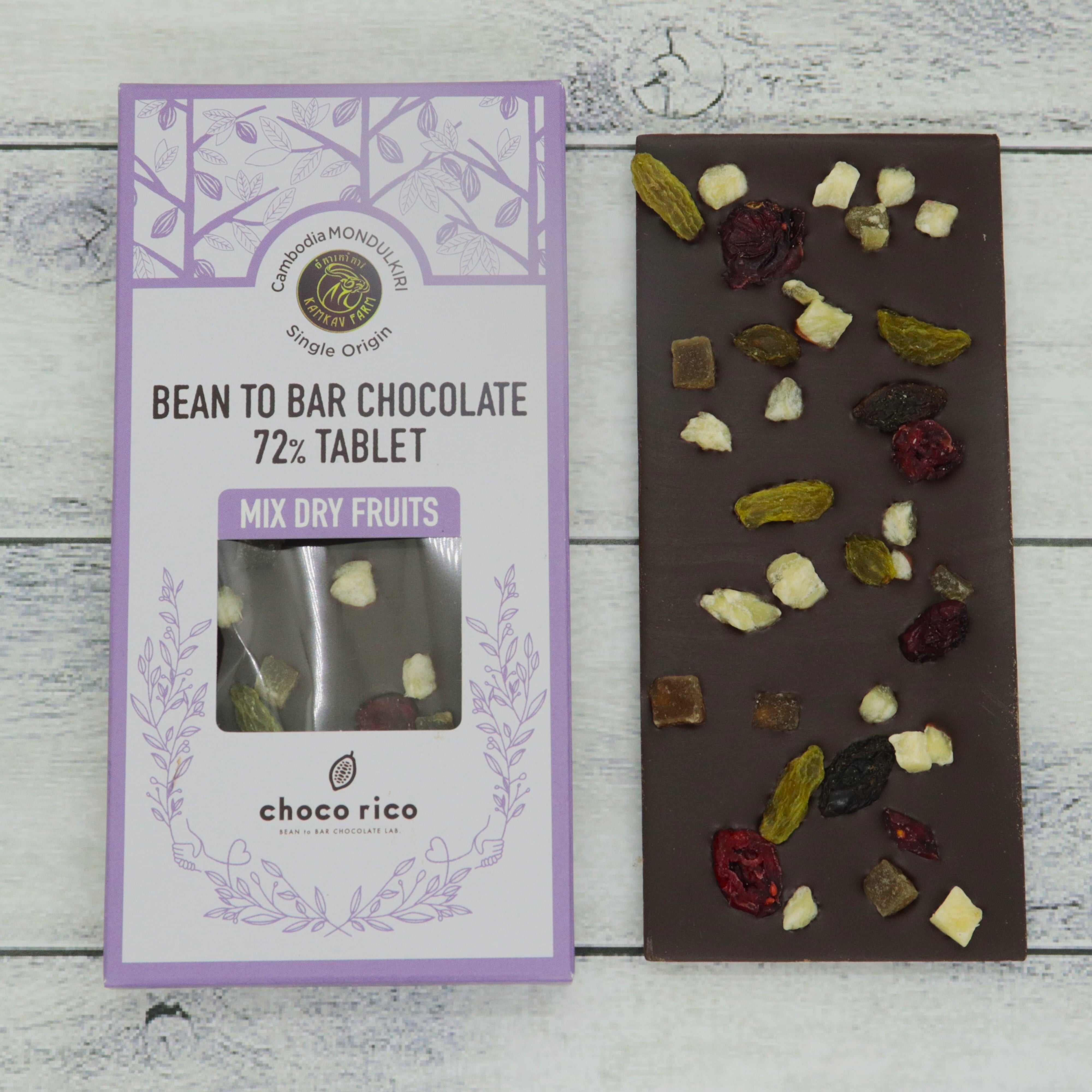 カンボジア産のオーガニックカカオ豆と天然パームシュガーだけを使用し、チョコリコの自社工房で丁寧に手作りしたカカオ72%のBean to Barチョコレートタブレット(板チョコ)に、ミックスドライフルーツをトッピングしました。