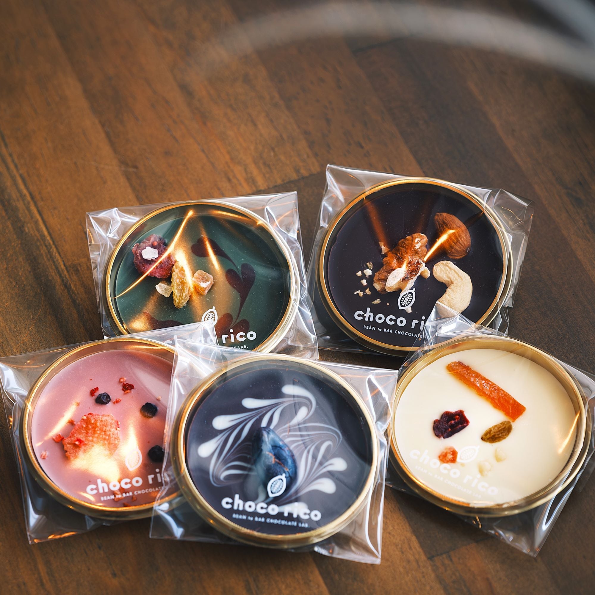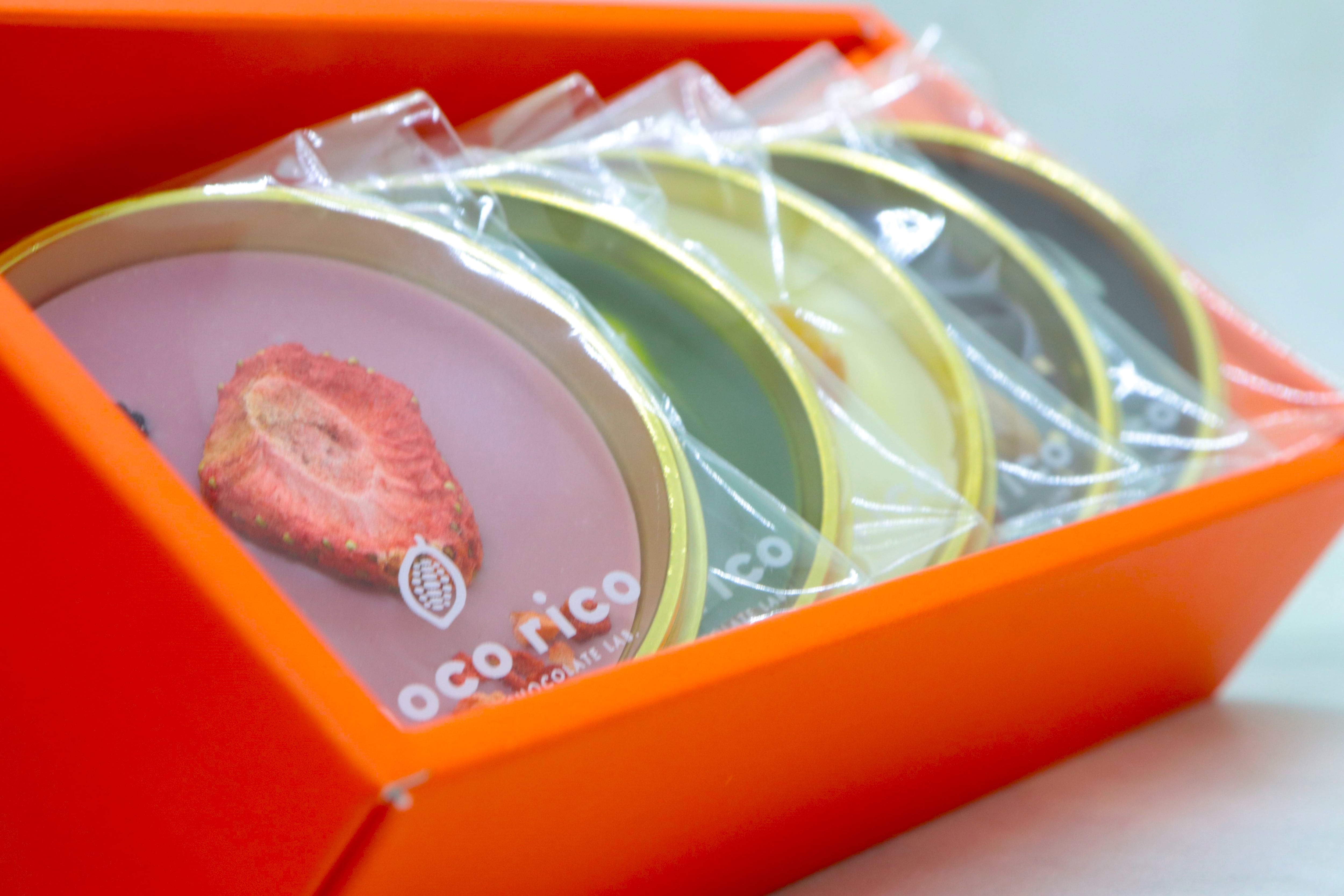 チョコレートにナッツやドライフルーツをトッピングしたチョコリコ特製「マンディアン」の5枚セットです。ビター、ミルク、ホワイト、ルビー、抹茶の5種類を専用箱にお入れしてお届けしますので、お手土産や贈り物にもぴったりです。