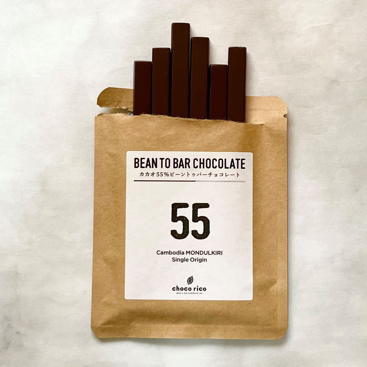 カンボジア産のオーガニックカカオ豆だけを使用し、チョコリコの自社工房で丁寧に手作りしたカカオ55%のBean to Barチョコレートです。