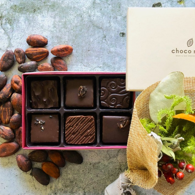 【Bean to Barチョコレートで作ったボンボンショコラ♪】 カンボジア産のオーガニックカカオ豆と天然パームシュガーのみ(白砂糖・添加物不使用)で製造した「Bean to Barチョコレート」を使用し、チョコリコの自社工房で丁寧に手作りしたボンボンショコラです。 ビター、ミルク、グランマニエ、ラムレーズン、コーヒー、黒ゴマの6種類のお味をご用意しました。 ビターとコーヒーはカカオ72%、ミルク・グランマニエ・ラムレーズン・黒ごまはカカオ61%のミルクチョコレートを使用し製造しています。 ※グランマニエにはオレンジリキュールを、コーヒーにはコーヒーリキュールを、ラムレーズンにはラム酒を使用しています。風味付け程度の量ですのでお車の運転等に支障はありませんが、お子様に召し上がっていただく際はご留意ください。 ----- チョコリコのBean to Barチョコレートはカンボジア産オーガニックカカオ豆と天然パームシュガーだけを使用し自社工房で丁寧に手作りしており、白砂糖・添加物・植物油脂不使用で身体に優しく、血糖値が上がりにくいチョコレートです。大切な方へのギフトにも最適です。 ----- ■原材料 <ビター> カカオ豆(カンボジア産)、パームシュガー、生クリーム、バター、転化糖 <ミルク> カカオ豆(カンボジア産)、脱脂粉乳、パームシュガー、生クリーム、カカオバター、バター、転化糖 <ラムレーズン> カカオ豆(カンボジア産)、脱脂粉乳、パームシュガー、生クリーム、カカオバター、レーズン、ラム、バター、転化糖、砂糖、水飴 <グランマニエ> カカオ豆(カンボジア産)、脱脂粉乳、パームシュガー、生クリーム、カカオバター、オレンジピール(グルコースシロップ(小麦含む)、砂糖)、バター、グランマニエ、転化糖 <コーヒー> カカオ豆(カンボジア産)、パームシュガー、生クリーム、バター、コーヒー豆、転化糖、コーヒーリキュール <黒ごま> カカオ豆(カンボジア産)、脱脂粉乳、パームシュガー、生クリーム、カカオバター、ごま、バター、転化糖 ※一部に乳成分、小麦を含む ■賞味期限 製造日より21日 ■内容量:6個/専用箱入り ■特定原材料(8品目):乳成分、(グランマニエのみ)小麦 ■保存方法 冷蔵庫(10℃以下)で保存してください。 ■配送方法 冷蔵